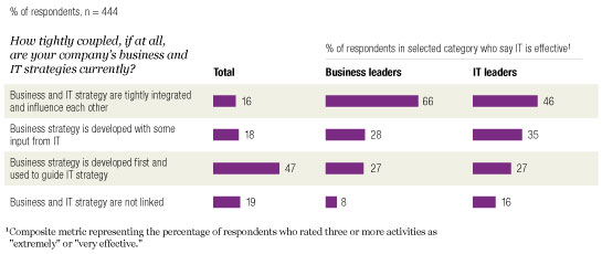 While the recession has shifted some short-term priorities for IT, the longer-term vision for IT remains consistent with views expressed by respondents in prior surveys. Non-IT executives continue to say they want to forge a closer partnership with IT in order to improve performance and better manage the risks and disruptions that lie ahead. While only 16 percent of respondents say they have put into place tightly coupled business and IT strategies (Exhibit 6), two-thirds of respondents indicate that this configuration would be their ideal. Significantly, the level of strategy integration is strongly correlated to the perceived effectiveness of IT: for both business and IT executives, effectiveness materially increases as the strategies become more tightly linked.