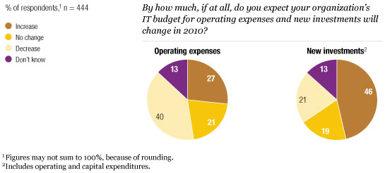 Looking forward to 2010, projections for operating budgets follow trends seen in last year’s survey. More than 60 percent of respondents expect IT operating expenses to decline or hold steady (Exhibit 3), reflecting a continued focus on “resetting” operating costs for an uncertain future.