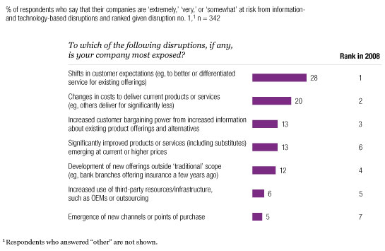At the highest level, all executives remain concerned about information- and technology-based disruptions—albeit with some key differences from last year. These worries include competitors embedding IT in their products, executing strategies based on better analytics and information, and using IT to improve the effectiveness of their business processes. The degree of concern has eased, however: in this year’s survey, 50 percent of respondents say their companies are very or extremely at risk given the potential effects of information- or technology-based disruptions on their companies, down from 65 percent in 2008. At the same time, the share of respondents rating their companies as somewhat at risk has increased to 30 percent, from 19 percent last year. Seen in the light of the overall survey, this finding indicates that while core concerns about disruptions remain in the short term, recession-related preoccupations have become more acute. Nonetheless, companies remain exposed to the key unknowns they cited in 2008: shifts in customer expectations and bargaining power as a result of access to better information, and significant changes in the cost to deliver existing products or services (Exhibit 5).