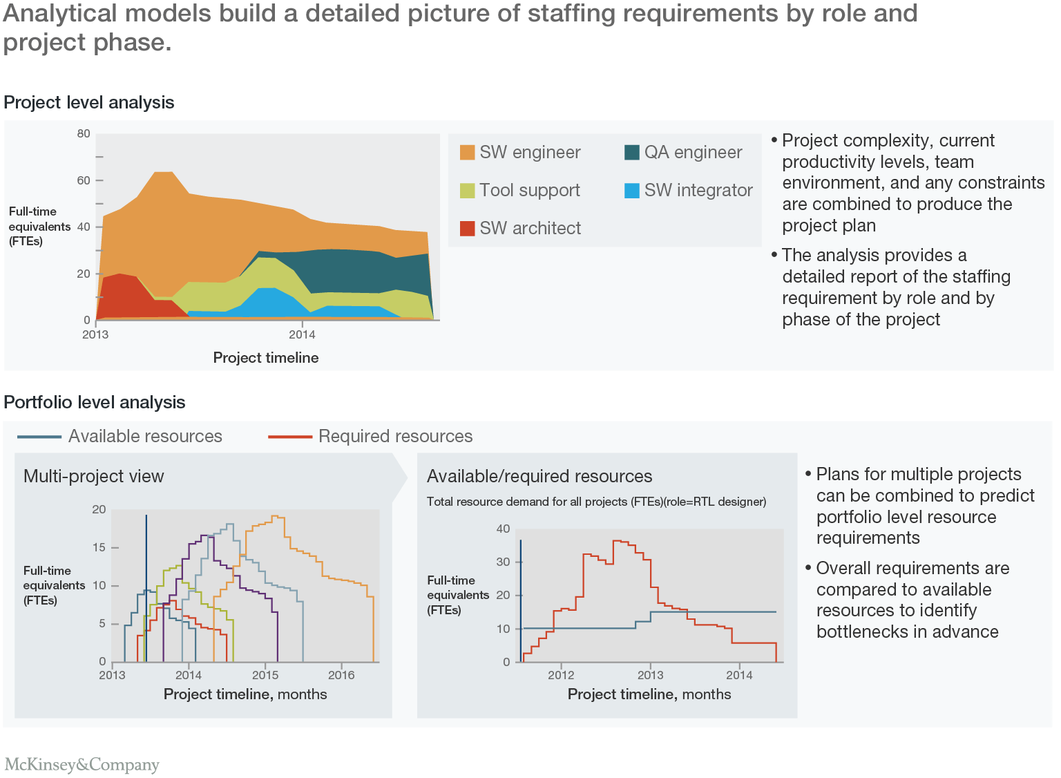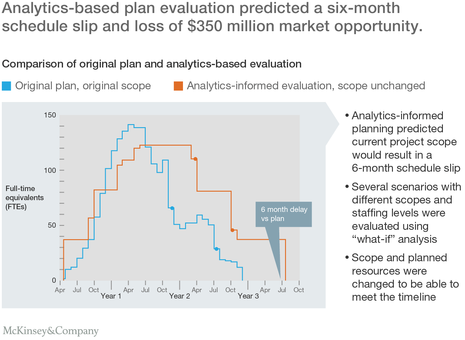Organizations that apply analytics and predictive tools to their product-development and project-planning processes see a dramatic reduction in schedule slippage. And because they can put the right number of the right people on their projects at the right time, they also see R&D productivity improvements of 20 to 40 percent. That means lower costs and lower risks—a powerful combination in a highly competitive environment