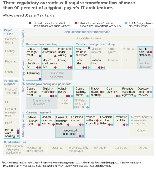 Three principal regulatory currents are producing the impending change: the recently passed federal health care reform bill, new health care IT mandates from last year’s US stimulus package, and ICD-10, a long-overdue expansion of coding standards for the exchange of health care data across payers and providers. Each of these forces will alter the way health care payers deliver services to patients and process the large flows of payments at the heart of the business. IT systems are central to both.