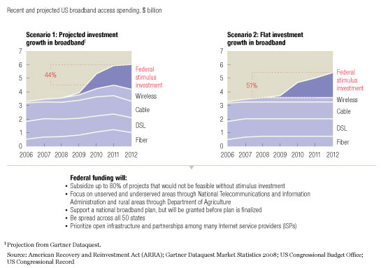 This spending could have complex and powerful effects on the companies that broadband technology touches, including large telephone carriers, cable operators, and wireless providers. It represents a significant part of projected telecom capital spending over the next few years (exhibit)—perhaps as much as 50 percent if the downturn continues to crimp private-sector spending severely. The choice of wireline rather than wireless technologies as the preferred delivery vehicle, for example, will have major competitive implications for service providers. In all likelihood, the impact will spill over to consumer electronics, because wireless access favors handhelds and smart phones, while wireline access drives demand for PCs.