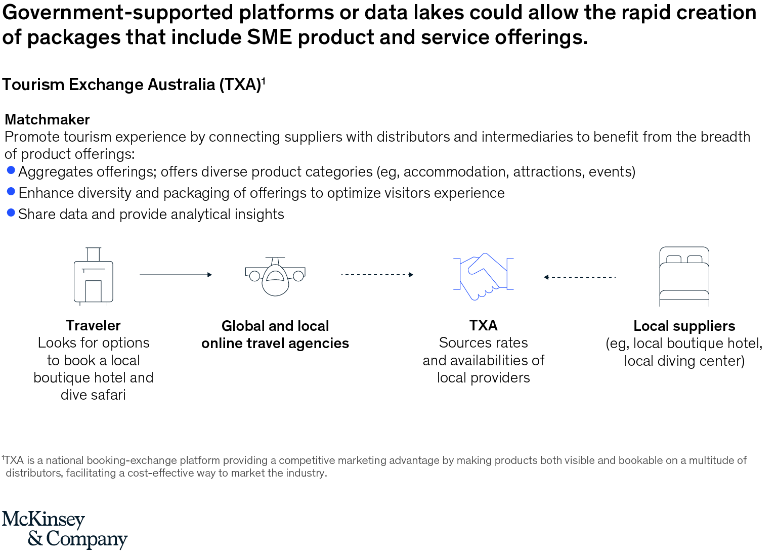 Governments are well-positioned to overcome the digital gap within the sector and to level the playing field for SMEs. The Tourism Exchange Australia (TXA) platform, which was created by the Australian government, is an example of enabling at scale. It acts as a matchmaker, connecting suppliers with distributors and intermediaries to create packages attractive to a specific segment of tourists, then uses tourist engagement to provide further analytical insights to travel intermediaries (Exhibit 3). This mechanism allows online travel agents to diversify their offerings by providing more experiences away from the beaten track, which both adds to Australia’s destination attractiveness, and gives small suppliers better access to customers.