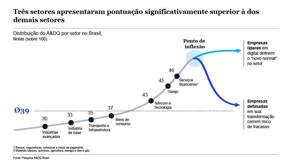 No Brasil, três setores claramente despontam em maturidade digital (pontuação acima da média geral): Serviços financeiros, Varejo, e Telecomunicações e Tecnologia –precisamente, estes são os setores mais afetados pelas mudanças de comportamento e necessidades do cliente, bem como pela dinâmica competitiva. Além disso, são os setores que se encontram mais próximos do ponto de inflexão de maturidade digital, no qual as empresas líderes definem o “novo normal” de um setor, fazendo com que as empresas defasadas em sua transformação corram maior risco de se tornarem obsoletas.