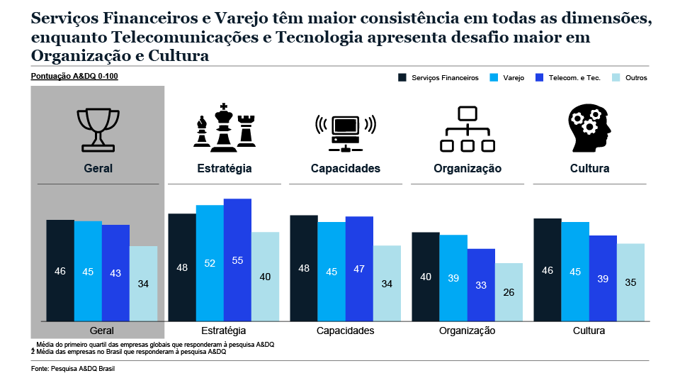No Brasil, os setores mais bem posicionados no estudo de maturidade digital são Serviços financeiros, Varejo, e Telecomunicações e Tecnologia, que apresentaram pontuação significativamente superior à dos demais setores como pode ser visto a seguir.