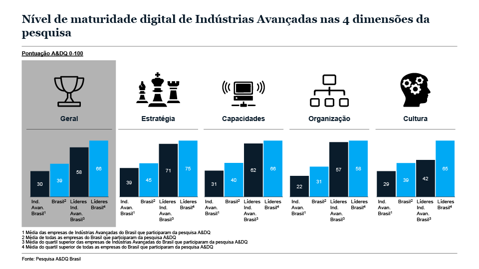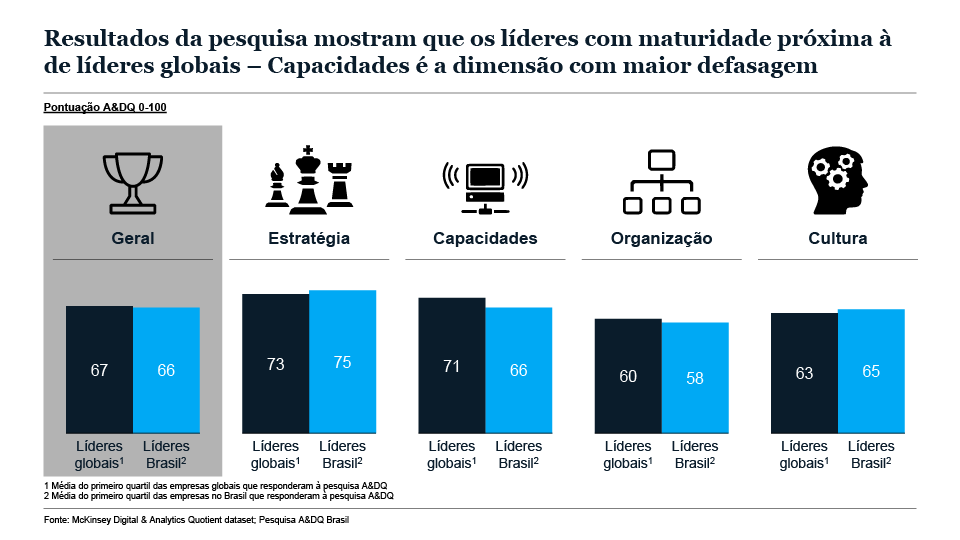 No Brasil, o estudo identificou que as empresas líderes têm probabilidade 3,5 vezes maior de ter uma vinculação clara entre o digital e a estratégia do negócio, apresentando 5 vezes mais chances de ter um roadmap de casos de uso detalhado do que as empresas iniciantes, conseguindo ampliar a estratégia com mudanças mais profundas e estruturais para além da linha de frente e dos canais digitais, independentemente da dificuldade de implementação.