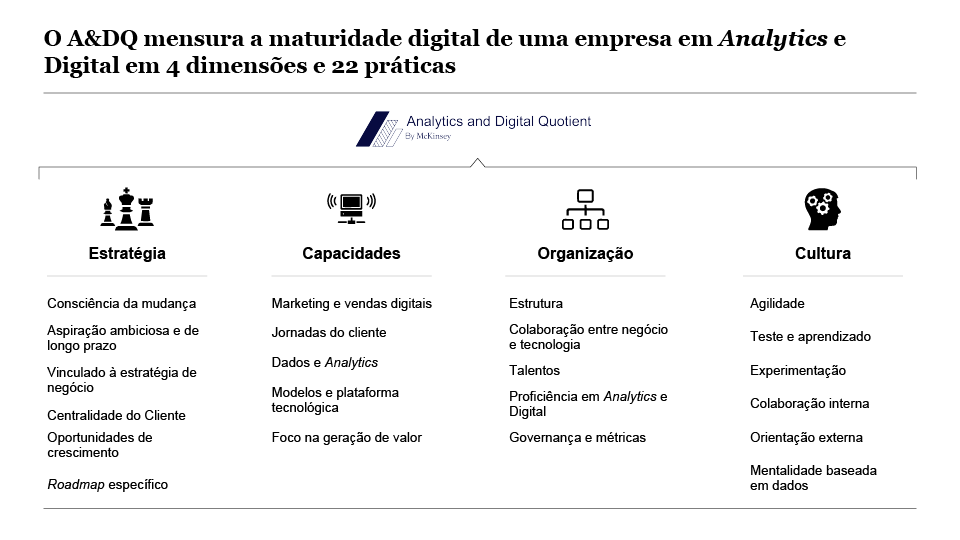 Com o objetivo de entender o efeito do processo de digitalização no Brasil, a McKinsey realizou um estudo com 124 empresas de grande e médio porte em diversos setores 3 para mensurar a maturidade digital das empresas que atuam no país. Para tanto, utilizou-se a ferramenta proprietária Analytics & Digital Quotient (A&DQ), que avalia 22 práticas de gestão críticas para o sucesso da transformação digital e captura de resultado financeiro, distribuídas entre as quatro dimensões mencionadas (Quadro 1). A ferramenta A&DQ atribui uma pontuação única que permite conduzir um benchmarking entre empresas pares e líderes em âmbito global.