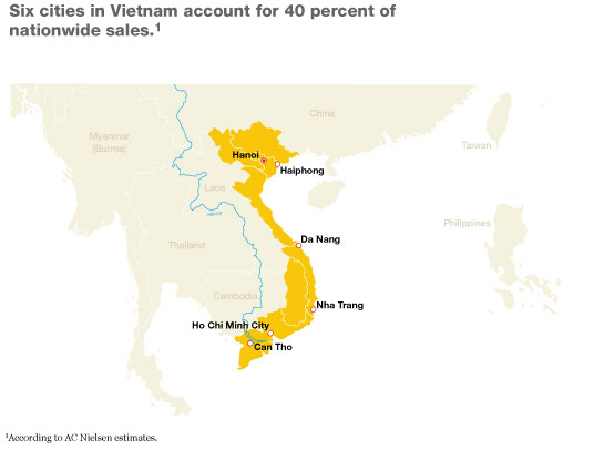 For retailers and consumer goods companies, Vietnam is an attractive market: the economy is growing briskly and sustainably, and the population is adding a million people a year. Even more important, the county’s middle class, now 7 million households, is growing fast. Vietnam’s literacy rate is 92.5 percent, and from 2003 to 2008 the number of college and university students nearly doubled. The cities, though mostly small, are expanding rapidly. Six of them—Can Tho, Da Nang, Haiphong, Hanoi, Ho Chi Minh City, and Nha Trang—account for 40 percent of the country’s sales, according to AC Nielsen estimates from 2007 (Exhibit 1).