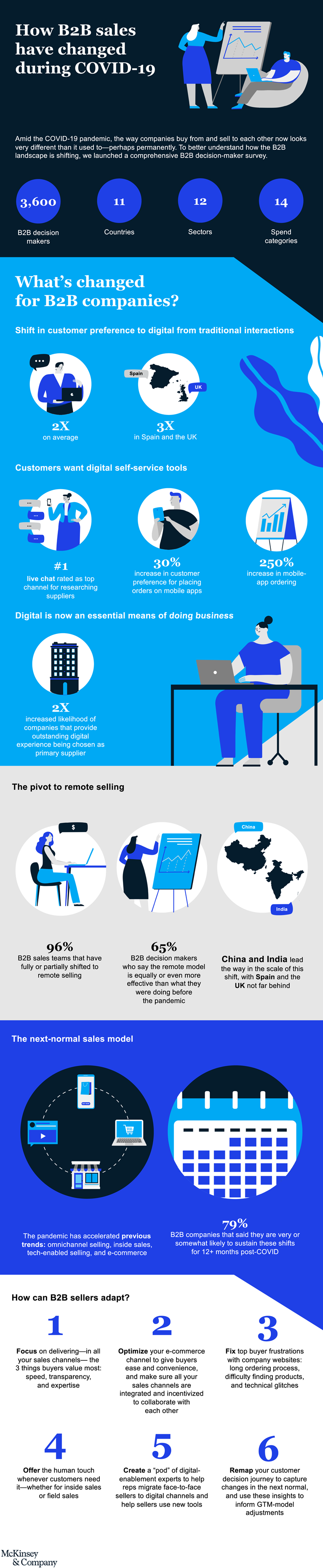 Amid the COVID-19 pandemic, the way companies buy from and sell to each other now looks very different than it used to—perhaps permanently. To thrive in the next normal, B2B companies will need to continue adapting to the new economic reality.
