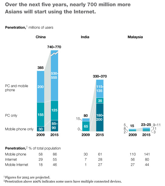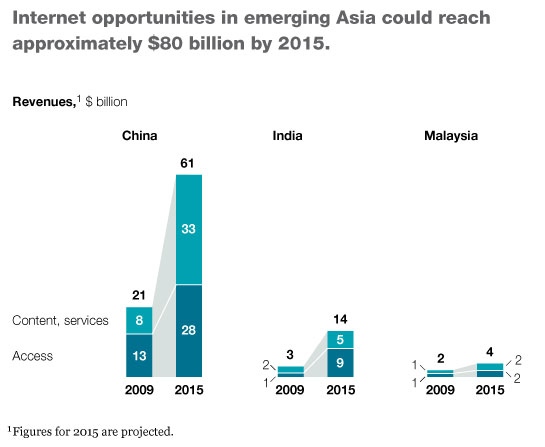 Asia’s emerging markets are poised for explosive digital growth. The region’s two largest economies—China and India—already boast some 500 million Internet users, and we forecast nearly 700 million more will be added by 2015 (Exhibit 1). Other emerging Asian nations have the potential to grow at a similarly torrid pace. We estimate that within five years, this billion-plus user market may generate revenues of more than $80 billion in Internet commerce, access fees, device sales, and so forth (Exhibit 2).
