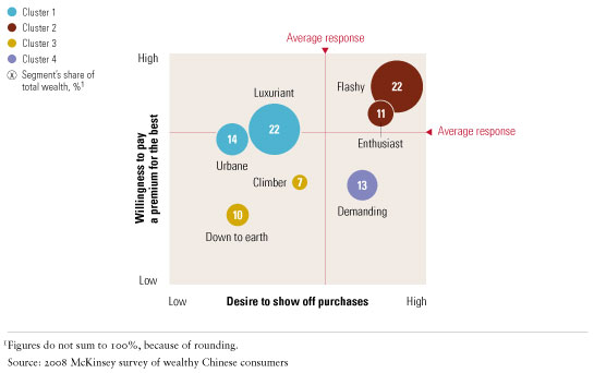 A company must also understand how the different segments relate to one another and craft strategies appealing to several of them to gain the greatest benefit from its efforts. Companies in most industries would gain, for example, from analyzing each segment according to the willingness of its members to pay a premium for what they regard as the best and their desire to flaunt their purchases, a characteristic we call “showiness.” Such an analysis, which groups the seven segments into four clusters (Exhibit 3), suggests, for example, that Chinese consumers in the two wealthiest are willing to pay a premium for what they regard as the best but that people in one cluster are more interested in showing off their purchases than people in the other.