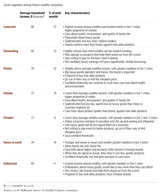 Despite the global downturn, the number of wealthy households in China continues to grow. By 2015, the country will hold the world’s fourth-largest concentration of wealthy people. Companies that better understand the factors behind their purchases could steal a march on the competition. Our research shows that their behavior is very different from that of their counterparts in other countries and of consumers in other income classes inside China.1 Indeed, the pool of luxury consumers has become large enough to form distinct segments, each with its own behavior and needs.