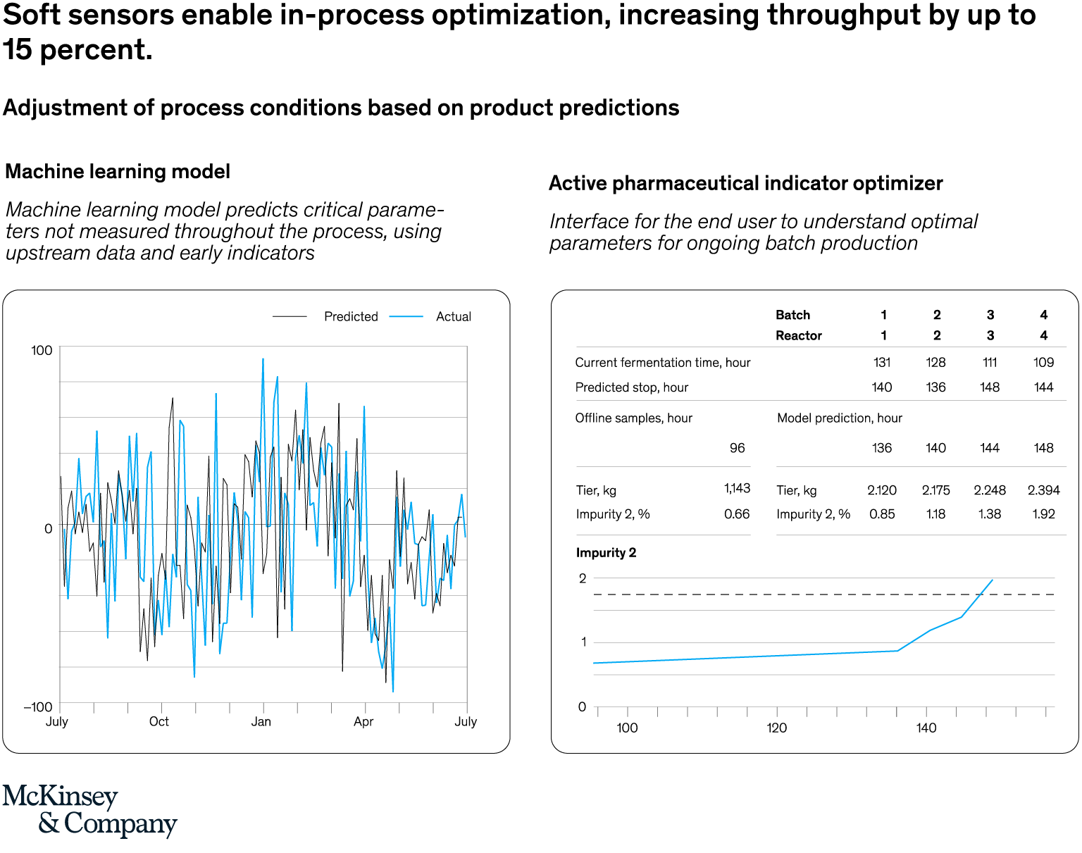 A clear application of this logic is used in “soft sensors,” which do not directly measure a quality attribute but instead use a model to calculate it based on other measurable parameters (Exhibit 3). This is particularly helpful in situations where directly measuring isn’t feasible or the process must be frequently interrupted for taking samples.