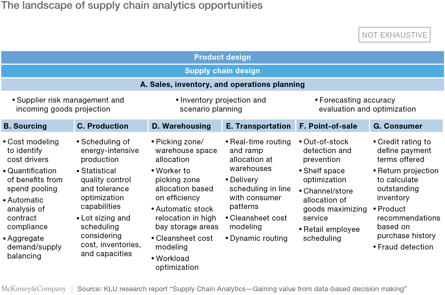 In the second part of this article series, we will show how companies can take control of the big data opportunity with a systematic approach. Here, we will look at the nature of that opportunity and at how some companies have managed to embed data driven methodologies into their DNA. Exhibit 1 provides an overview of the landscape of supply chain analytics opportunities.