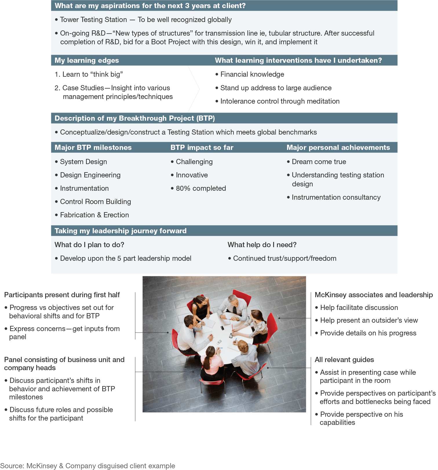 • Breakthrough projects. An important element of leadership development is enabling participants to move out of their comfort zones by creating stretch opportunities. Breakthrough projects—projects critical to the organization’s strategy—were used to give leadership trainees real experiences that had a visible impact on company performance. Participants were carefully fitted to each project to ensure passion and relevance to the participant’s personal development areas (Exhibit 4).