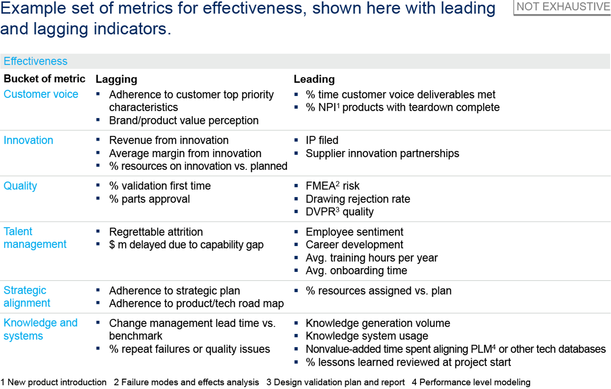 While one robust formula is helpful to understand engineering productivity, there are a number of additional leading and lagging indicators that help companies to delve deeper, so that they can measure both efficiency and effectiveness within the product development organization and process (Exhibit 1).