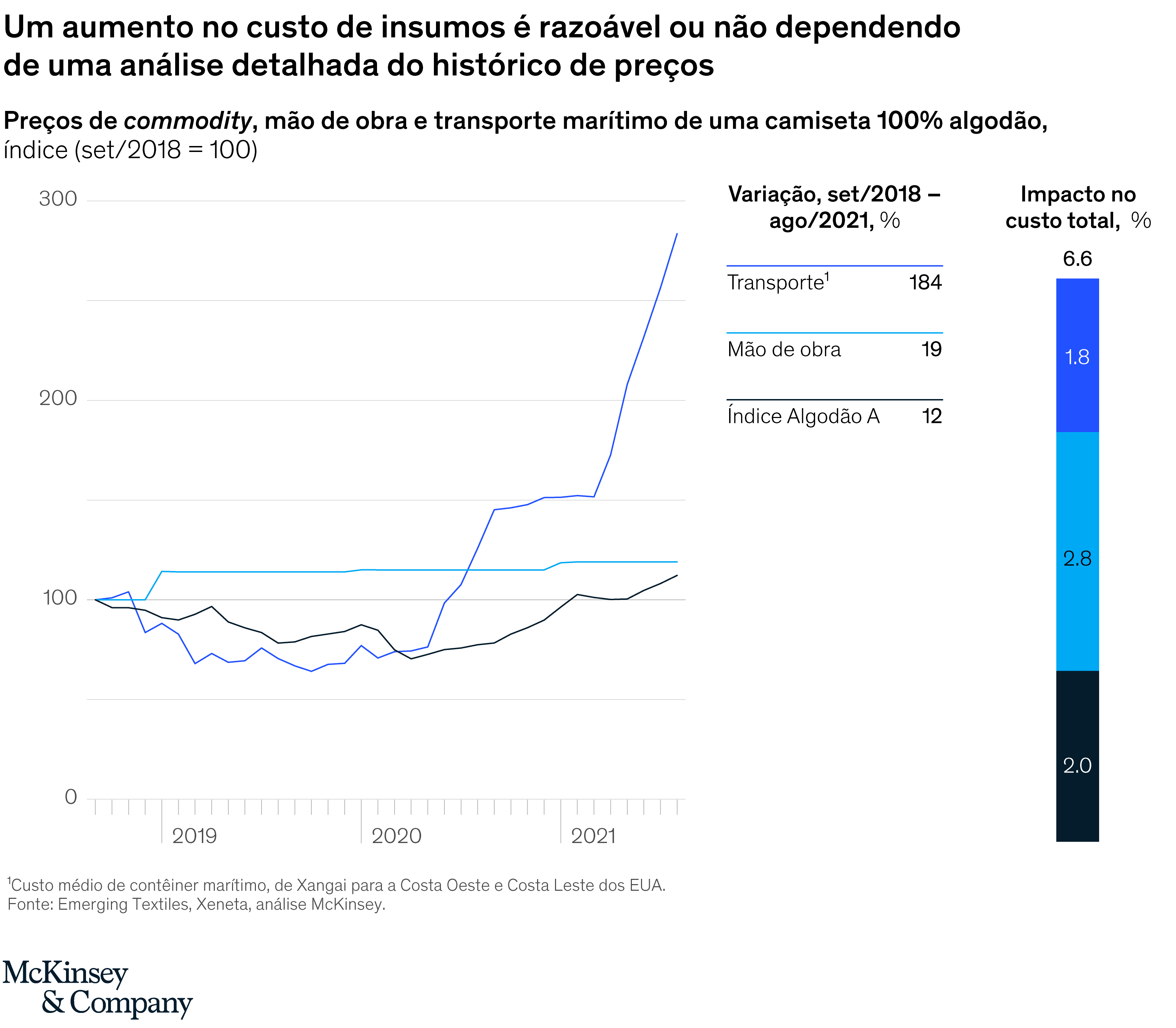 Em seguida, o varejista estimou a porcentagem do custo total que esses inputs representavam. A expectativa era de que o tecido representasse cerca de 50% do custo total de uma camiseta masculina. Faz sentido pressupor que a fibra de algodão (que tem um índice de commodity, cujo custo é relativamente fácil de pesquisar) representa aproximadamente um terço do custo do tecido.