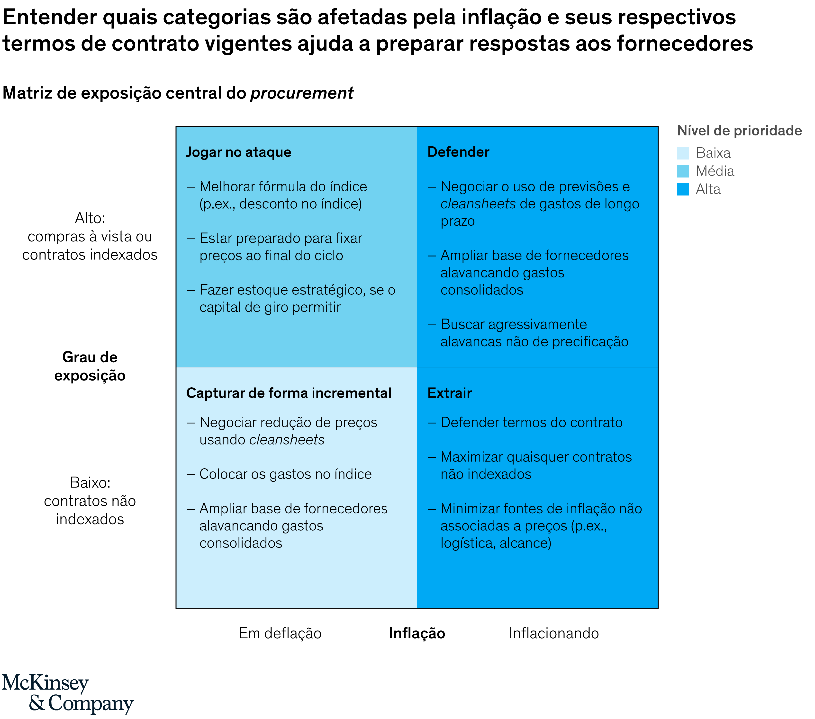 O Quadro 2 mostra como uma matriz de exposição que considera a inflação (ou deflação) e o grau de exposição às forças do mercado podem ajudar a identificar um conjunto abrangente de alavancas comerciais e técnicas que sustentam uma postura defensiva em relação à inflação. Algumas alavancas podem mitigar imediatamente os aumentos de custo, enquanto outras fortalecem a resiliência futura.