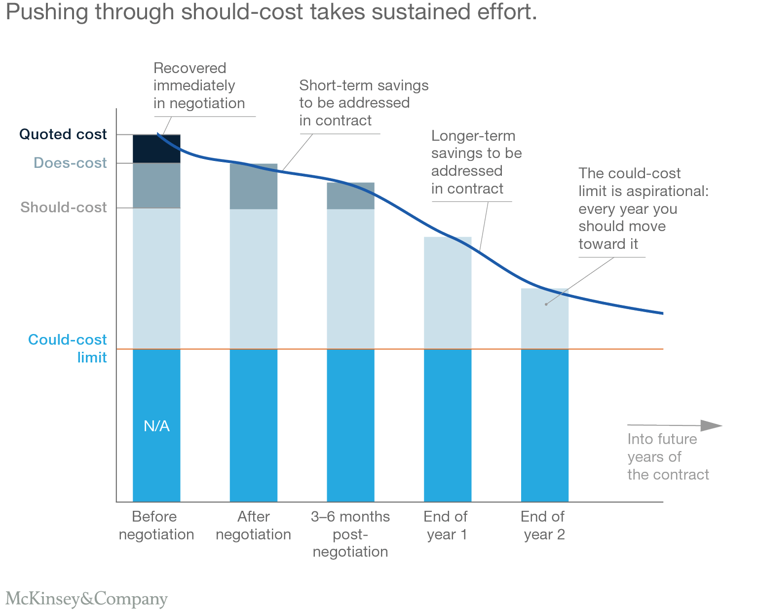 The key to closing the gap between could-cost and quoted or invoice cost is to break the gap down into smaller and more actionable cost segments, each with clear assumptions that can be compared with the supplier's assumptions. The team can make good progress towards does-cost in its first negotiation with a supplier (or an internal provider). Some of the could-cost to quoted-cost gap will require future actions, both internally and at the supplier, and these must be scheduled and tracked to gain savings. And although the quoted or invoiced price may never fully match the should-cost, with good oversight, the team can close more of the gap every year.