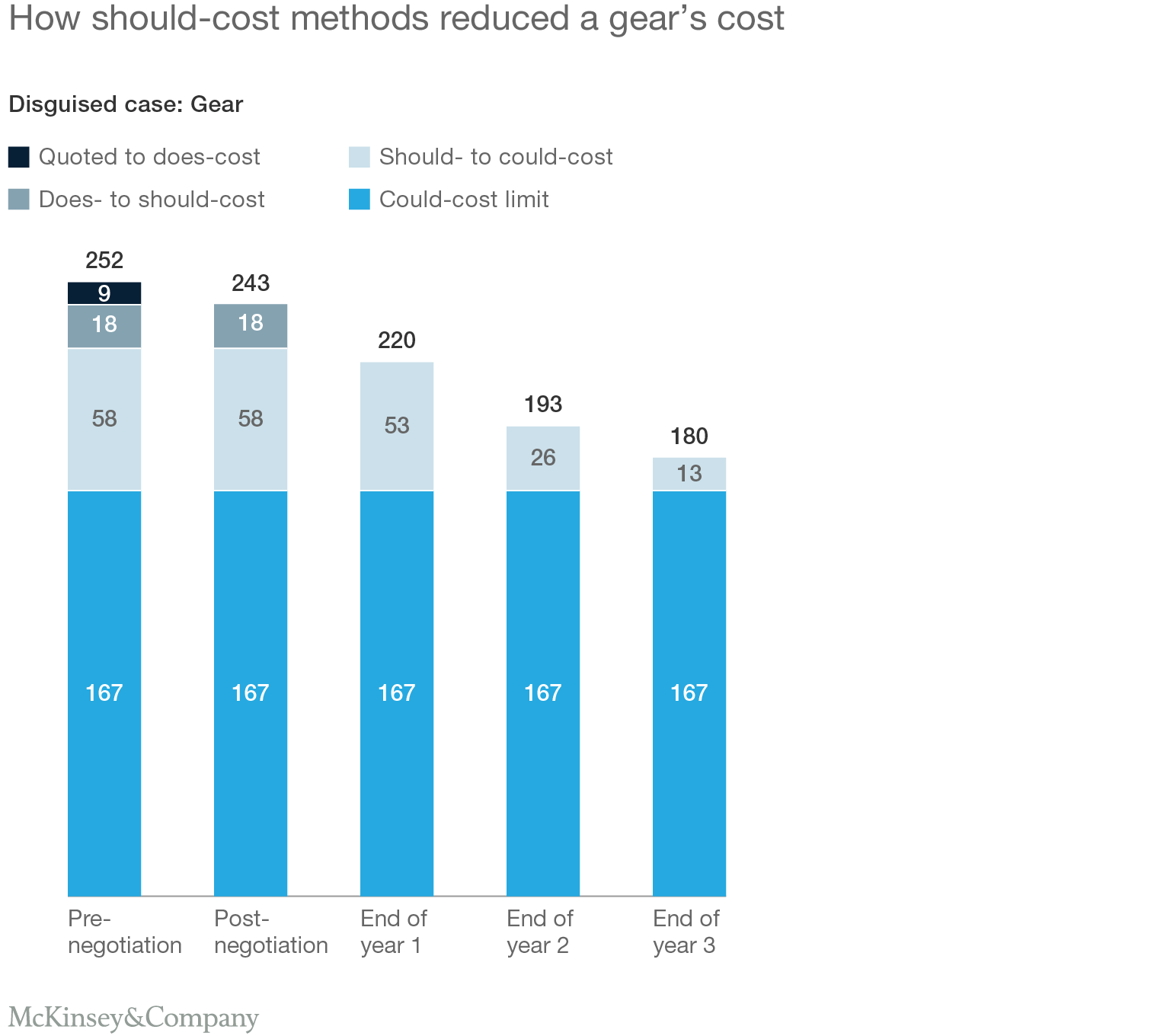 The vertical axis in Exhibit 1 shows the segments of a part's cost, calculated using Cleansheet analysis. Before negotiation, in the column at left, the calculated could-cost (the bright-blue segment) shows the minimum cost that can be achieved without major redesign or feature changes. The light-blue segment, representing the should- to could-cost gap, shows limitations that require substantial longer-term action to correct, often involving capital investment or new-supplier development. The grey does- to should-cost segment comprises smaller changes that can be done in the medium term. Finally, the black segment (quoted to does-cost) is what the team should be able to recover immediately in negotiation.