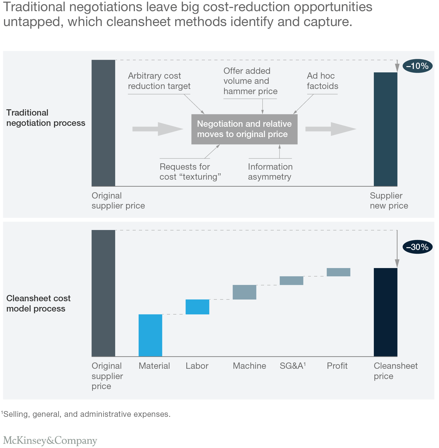 The Cleansheet methodology thus shifts the customer-supplier interaction from opaque and arbitrary traditional negotiations, based on a relative price movement, to transparent, fact-based bottom-up cost and profit estimates (Exhibit 3). Accordingly, the process usually results not only in greater savings, but also in better relations between supplier and customer: both sides of the table are aligning on the real reasons for gaps between the quote and the customer's expectations.