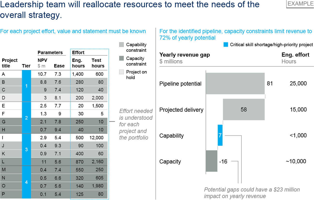 Allocate resources and update project plans. Based on this strategic overlay, managers should revisit the assessment of capacity and capability constraints and report back to senior leadership on the implications for resource planning. A planning tool that highlights capability and capacity constraints can be used for detailed resource planning. With these inputs, managers can finalize resource allocation and develop high-level project plans.