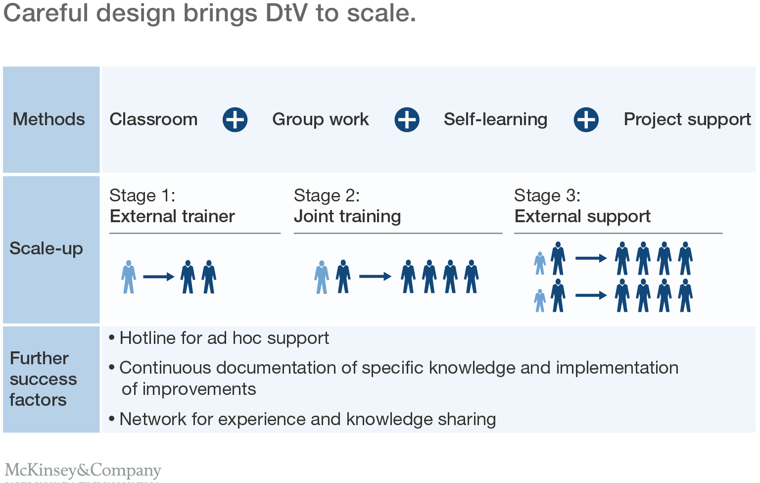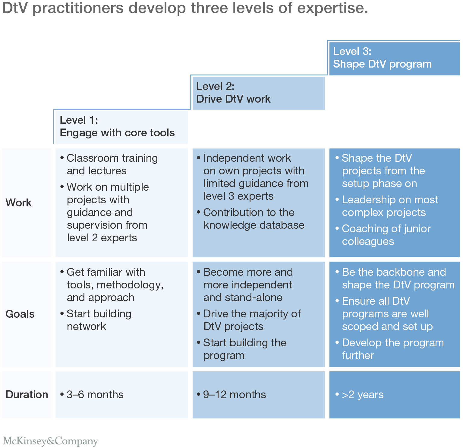 As a company becomes more familiar with DtV techniques, demand for specialist support will grow: it may soon discover it needs an expert hotline for project teams seeking help for emerging DtV challenges. And growing the dedicated DtV department may require more than just new hires. A proven way to build the required expertise is through a train-the-trainer approach, using pilot projects as a learning environment for new recruits. Many organizations also find it useful to draw upon external expertise during the early evolution of their DtV capabilities, although this requirement should naturally taper away as in-house expertise increases.