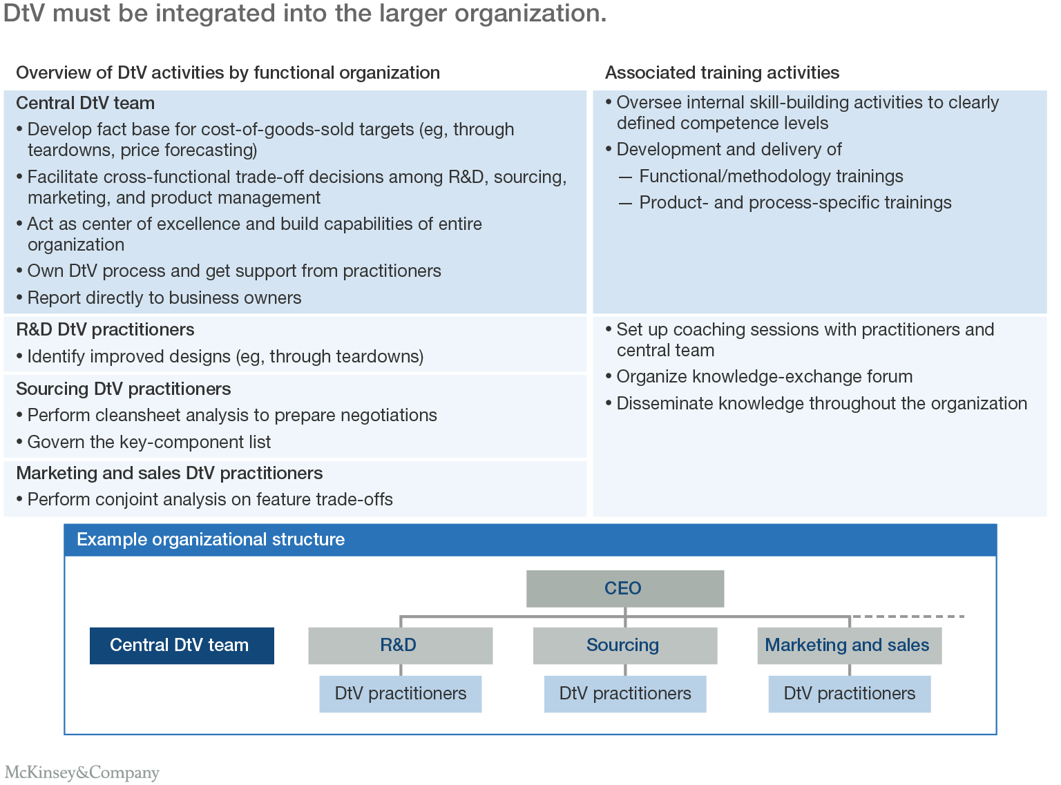 Such organizations still make use of central DtV department, which may report to the head of a particular function—perhaps procurement or controlling—or to the overall leader of the organization (Exhibit 3). This team is responsible for the institutionalization of DtV: ensuring consistency, best-practice sharing, and training delivery across all business units. Team members team have deep expertise in DtV tools, and can also facilitate workshops and moderate conflicts between individual functions such as R&D, procurement, manufacturing, or marketing and sales.
