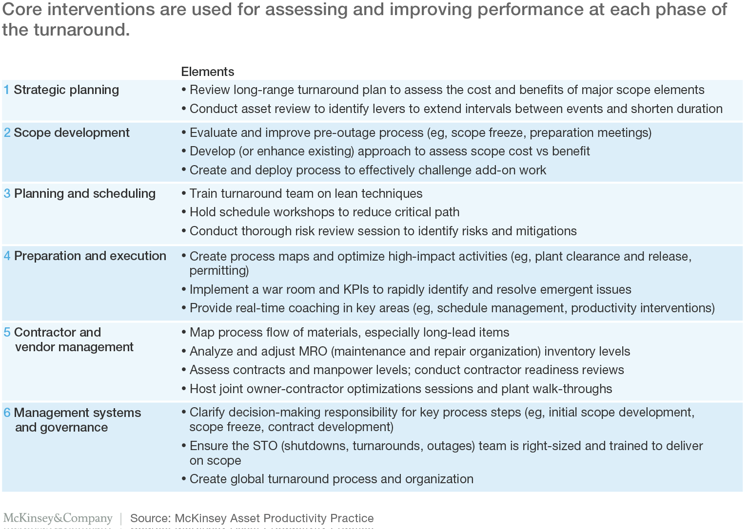 To minimize these issues, the best companies take a highly systematic approach to the management of turnarounds. They identify the processes, capabilities, and resources they need for all aspects of the turnaround. Before each turnaround event, they conduct a review to ensure all these elements are in place and carry out training where necessary to fill any gaps.