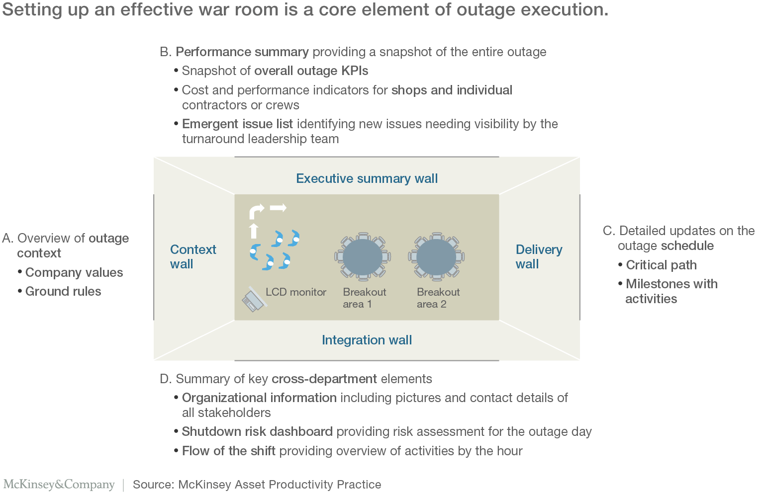 Placing dedicated teams against each element of outage preparation and execution, including emergent issue management, has been shown to consistently improve performance. Top-performing companies have also found it useful to manage turnaround preparation and execution using regular "War Room" meetings held in a dedicated space with visual displays of critical information such as outage context, performance metrics, schedule updates, and cross-functional enablers (Exhibit 3). Putting information and decision-makers together in one place ensures everyone has the same picture of turnaround progress, and enables faster, fact-based decision-making when issues emerge.