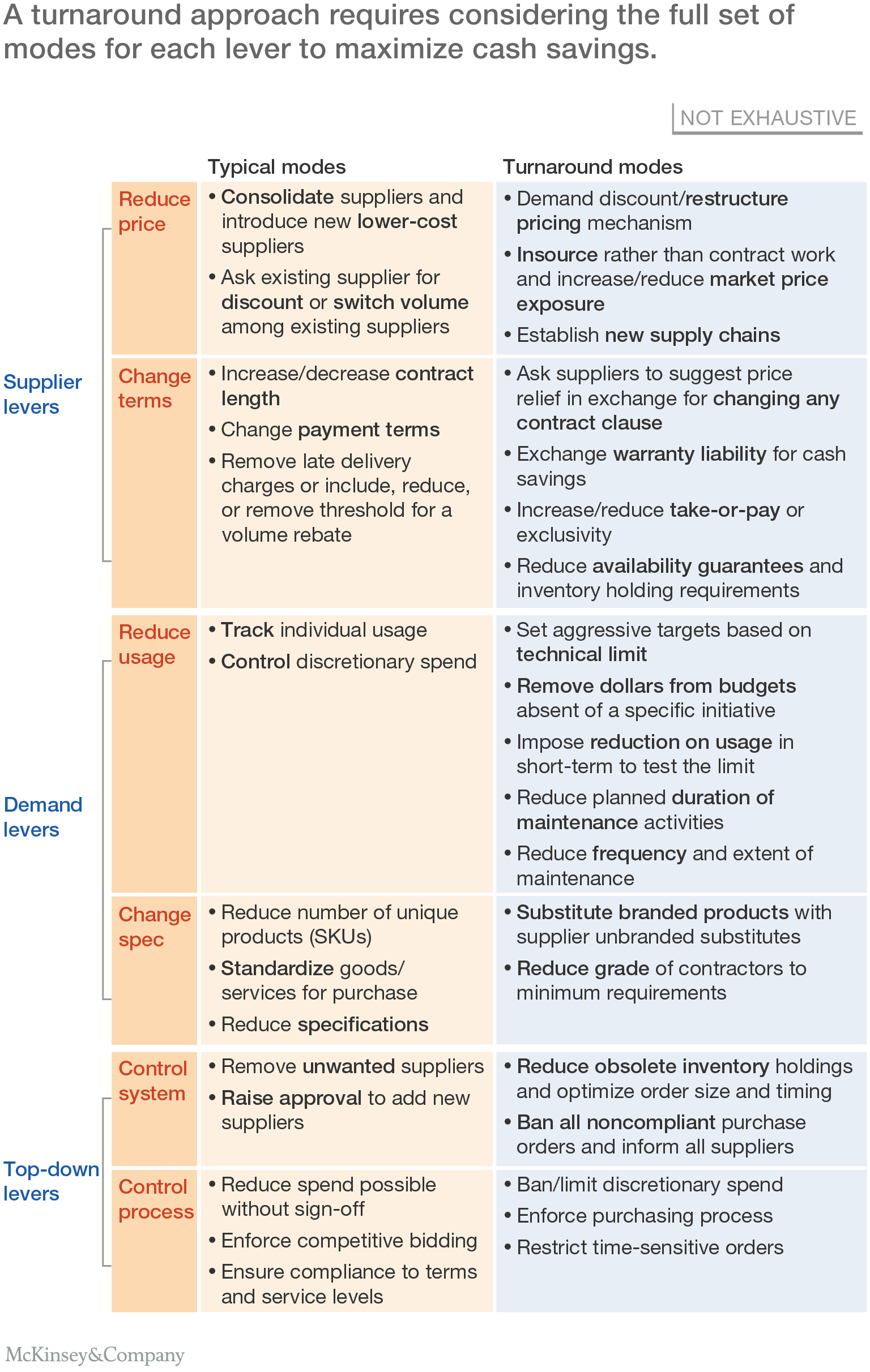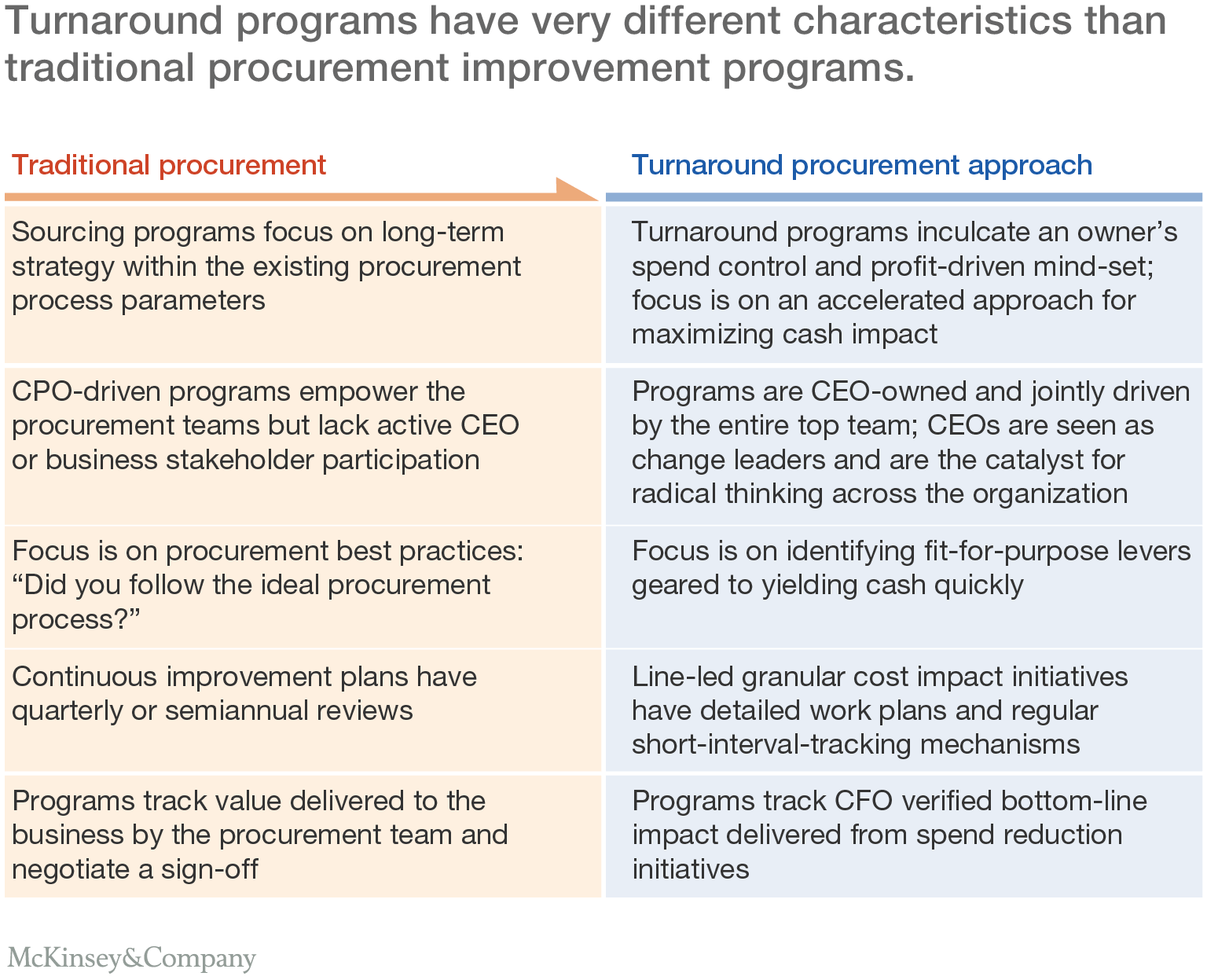 Although many companies have experience with programs to improve procurement performance, companies under cash pressure require a more fit-for-purpose approach to meet their need for rapid cash generation. The aggressive cost reductions needed in turnaround situations require very different measures than traditional procurement improvement program (Exhibit 1).