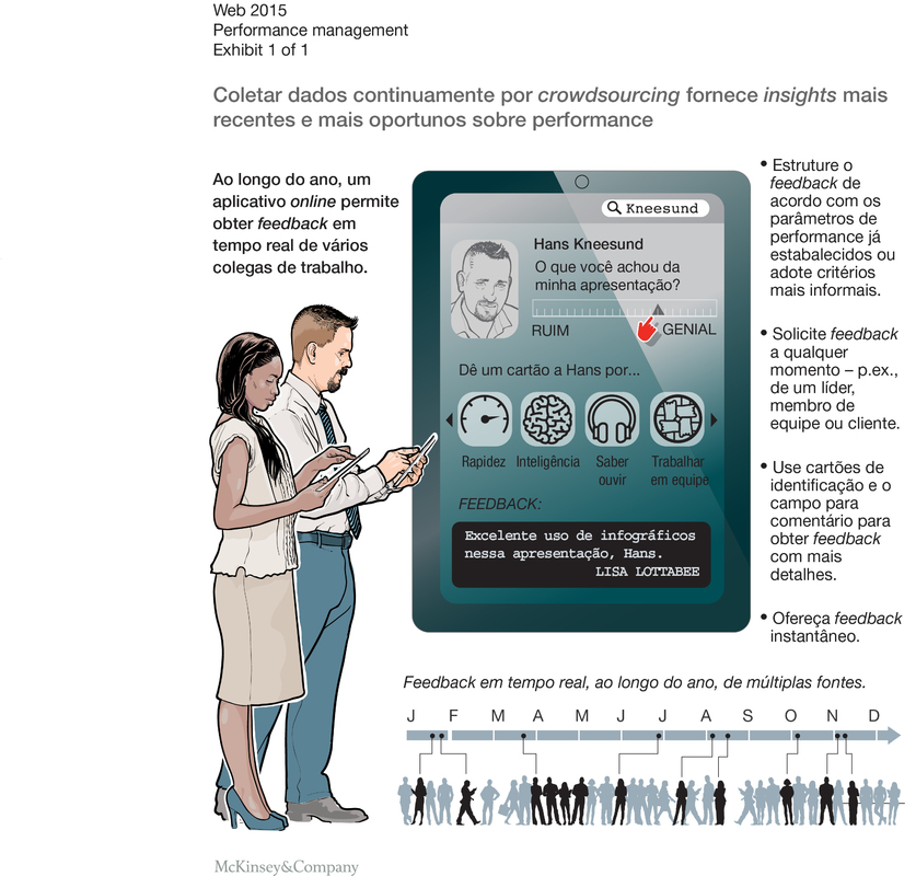Por exemplo, a Zalando, um importante varejista online europeu, está atualmente implementando uma ferramenta de crowdsourcing em tempo real que obtém feedback estruturado e não estruturado de performance a partir de reuniões, sessões de resolução de problemas, projetos concluídos, lançamentos e campanhas. Os funcionários podem solicitar feedback de supervisores, colegas e “clientes” internos por meio de um aplicativo online em tempo real que permite às pessoas fazer comentários positivos e críticos umas sobre as outras, de forma lúdica e envolvente. O sistema então atribui um peso a cada resposta conforme o grau de exposição entre o fornecedor e o solicitante dos dados. Para cada tipo de comportamento ao qual os funcionários solicitam ou fornecem feedback, o sistema – uma ferramenta estruturada e fácil de usar – apresenta uma lista de perguntas que podem ser respondidas de forma intuitiva movendo-se um controle deslizante na tela de um smartphone ou dispositivo similar. Como os dados são coletados em tempo real, tendem a ser mais precisos que as revisões anuais, quando colegas e supervisores têm de se esforçar para lembrar detalhes sobre as pessoas que vão avaliar.