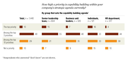 Nearly 60 percent of respondents to a recent McKinsey survey1 say that building organizational capabilities such as lean operations or project or talent management is a top-three priority for their companies. Yet only a third of companies actually focus their training programs on building the capability that adds the most value to their companies’ business performance.