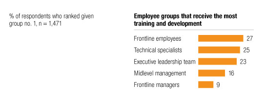 While frontline employees are provided with extensive training, managers are not (Exhibit 4)—even though for many, their present jobs may represent their first experiences leading others. Perhaps frontline managers receive less training because of the way their jobs are designed at most companies: managers are expected to ensure that their direct reports do the things that the managers themselves excelled at to begin with.