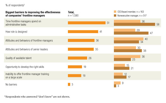Executives say the biggest barriers to improving the effectiveness of frontline management involve how the jobs themselves are structured (Exhibit 5). Managers spend too much time on administrative tasks, and their responsibilities are limited to fixing problems as they arise and following and giving orders. Constantly solving unexpected problems and being rewarded for doing so may also create negative unintended consequences, as managers will likely lack the motivation to anticipate problems in the first place.