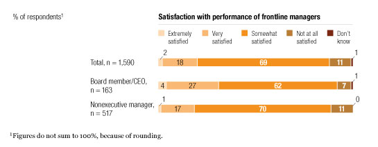 Senior executives and nonexecutive managers are unhappy with the performance of their companies’ frontline managers, according to a McKinsey survey.1 The low level of satisfaction, the results indicate, stems from the way frontline managers’ jobs are structured and from inadequate training, not merely a lack of skills on the part of frontline managers.