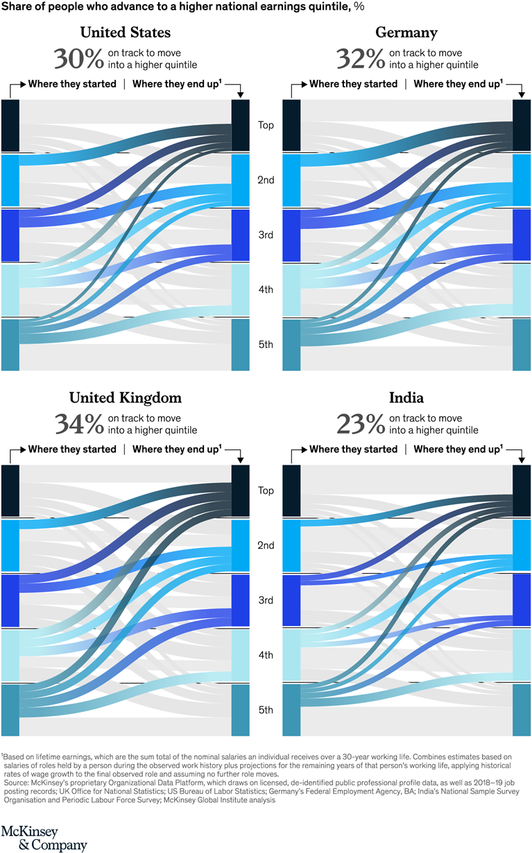 In all the countries we studied, a sizable cohort is on a path to move up one or more earning quintiles from their career starting point. This applies to roughly one-third of workers in advanced economies (30 percent in the United States, 32 percent in Germany, and 34 percent in the United Kingdom) and to 23 percent of workers in India. In the United States, some 6.1 percent are on track to move from the bottom to the top quintile in earnings.