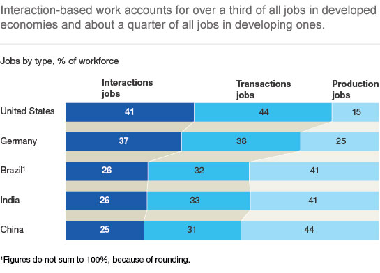 Through all such changes, a broad swath of employment remained largely untouched: work requiring extensive human interactions. Among these positions are the jobs held by knowledge workers—the doctors, engineers, lawyers, managers, sales representatives, teachers, and other skilled professionals who together serve as the engine of the knowledge economy. Research from McKinsey and others has shown that such interaction workers are vital to the competitive success of companies and countries alike.1 Interaction work is the fastest-growing category of employment in developed countries, where it already accounts for a large proportion of jobs (Exhibit 1).2 Because technology has tended to complement, not replace, labor in interaction work, until recently many of these jobs had essentially been performed in the same ways for decades.