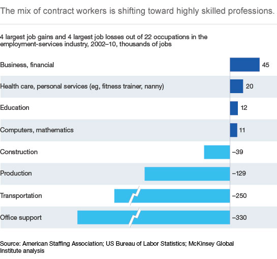 The workforce appears ready. An expanding industry of intermediaries and “talent aggregators” has cropped up to supply interaction workers ranging from drug-development scientists to advertising copywriters to investment bankers and attorneys. In the United States, 45 percent of temporary employees work in management, in IT or technical occupations, or in health care, and contract work has grown four times faster than total employment over the past decade. Moreover, while many less-skilled temporary workers were laid off during the recent recession, contingent work among more highly skilled professionals has continued to grow (Exhibit 2).