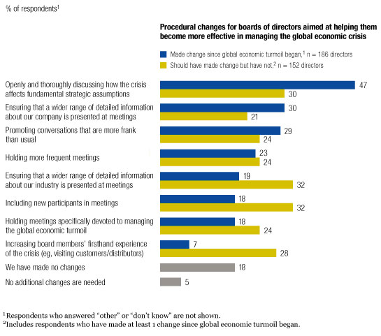 Today, boards are probably underreacting to the stresses—and opportunities—of economic turmoil. Directors themselves seem to agree: a McKinsey survey conducted in conjunction with an article published earlier this year1 showed that only half of the 186 directors responding thought their boards had met the demands of the crisis. Just 30 percent reported that a wider range of information was now presented at board meetings or that conversations were more frank than usual (exhibit). Even among directors who believed that their boards had responded effectively, overall, to the crisis, only 19 percent felt that those boards had really addressed the problems of talent management—meaning not only the composition of the board but also its role in hiring and remunerating senior executives.