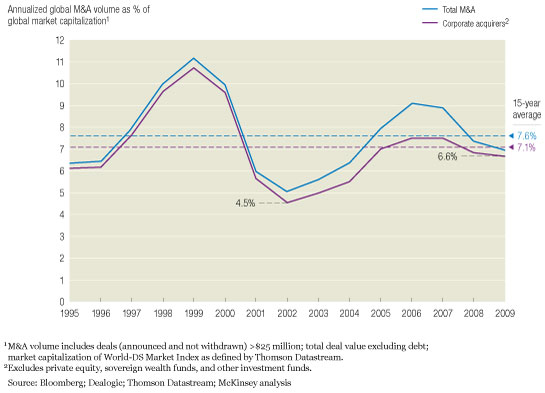 Overall, conditions improved in the fourth quarter, and companies increasingly found attractive deals and the means to complete them. That increase in activity appears set to continue in 2010, if current trends continue. But companies should take note: with the S&P 500 up 65 percent since last March, the era of highly undervalued assets is probably over, so acquirers must redouble their attention to fundamental drivers of value.2 We expect that large corporate buyers will be particularly well positioned to take advantage of any new wave of M&A, but we also see private-equity firms returning to the market.