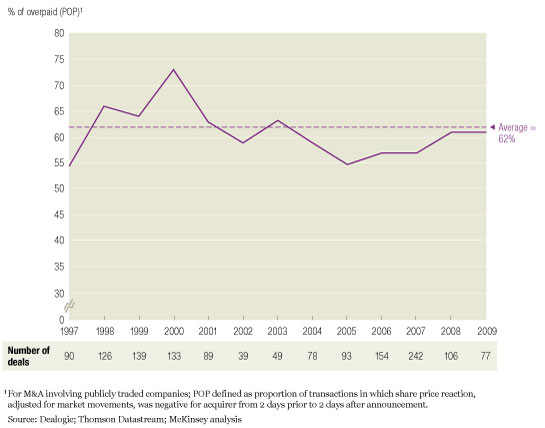 The reduction in DVA since then has resulted from a continuing decline in the average value created for acquirers. This decline is reflected in the increasing number of deals in which the market reaction has been negative for the acquirers, suggesting that they may have overpaid.4 Indeed, the proportion of overpaid (POP) stayed at 61 percent in 2009, the same as for 2008 (Exhibit 3). Although market skittishness in early 2009 may have skewed the index toward the high side, we believe it is still generally correct as an indicator. In some cases we observed, share prices fell following a merger’s announcement—even when the value of the cost synergies alone more than covered the premium paid and even when analysts deemed those estimates of synergies too conservative. Yet short-term market reactions, historically, have been a good indicator of long-term value creation through M&A.