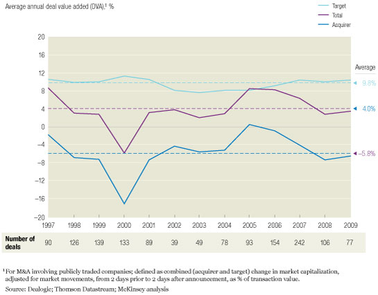 • More value created—but more given away to targets. The value created by M&A, measured as the capital market’s reaction to deal announcements, reversed a three-year declining trend, with the total deal value added (DVA)3 increasing to levels slightly below the long-term average. Still, that was only a bit more than half of the value created by the more disciplined deal making of 2005 to 2007 (Exhibit 2).