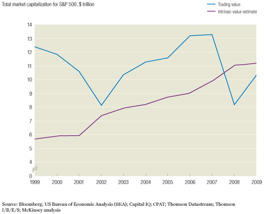 If the trends that produced the significant increase in fourth-quarter 2009 deal activity—up more than 40 percent from the average for the first three quarters—continue to operate, conditions appear right for the market’s further acceleration in 2010. For one thing, uncertainty in both the economy and the stock market has fallen dramatically over the past year, with volatility5 hovering between 20 and 25 percent at the end of 2009, down from its peak of around 80 percent in late 2008. Also, both the credit and the equity markets are again financing M&A deals; credit spreads are back to reasonable (though not pre-crisis) levels; and the IPO market, virtually closed in the first half of the year, is now trending toward a 40 percent increase over 2008. Finally, even if stock markets have recovered very strongly, market valuations are still favorable compared with historical levels. Indeed, the market value of the S&P 500 as of December 2009 remained below its intrinsic value,6 though it closed most of the gap seen in 2008 (Exhibit 4). If a wave of M&A does materialize, as many expect, large public companies should be particularly well positioned to benefit.