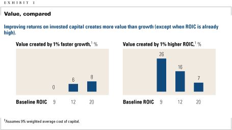 When a company's ROIC is already high, growth typically generates additional value. But if a company's ROIC is low, executives can create more value by boosting ROIC than by pursuing growth (Exhibit 1). A close look at companies with high price-to-earnings multiples shows that many have extraordinary returns on capital but limited growth. This scrutiny suggests that, contrary to conventional wisdom, investors recognize (and will pay more for) the anticipated returns of companies with a strong ROIC, despite their limited growth prospects. This observation doesn't mean that growth is undesirable; unless companies keep up with their industries, they will likely destroy value. But they shouldn't pursue growth heroically at the expense of improvements in ROIC.
