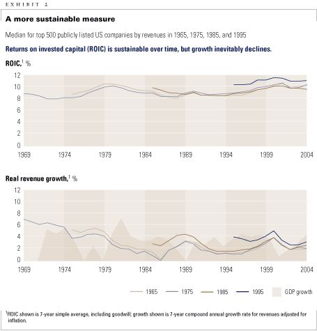 Growth, by contrast, is fleeting. The median inflation-adjusted growth in revenues for the top 500 companies in 1965 started out at 7 percent and steadily declined to 2 percent over the next 10 years, hitting a cyclical low of 0 percent by year 17. For the next 20 years, growth hovered at around 2 percent—a figure below the level of US GDP growth.2 We observed a similar general pattern of decay in median real growth for the top 500 companies in 1975, 1985, and 1995.