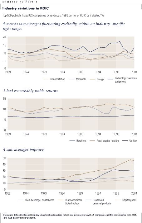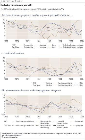 Moreover, pattern analysis at the industry3 level further shows the importance of managing ROIC. A comparison of ROIC4 for the top 500 companies of 1965 shows that it remained steady in most sectors and even increased in some—particularly those with strong brands or patent-protected products (household and personal goods, for example) and pharmaceuticals and biotechnology (Exhibit 3, part 1). Growth, by contrast, almost always declined, except in pharmaceuticals (Exhibit 3, part 2).