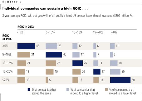 A close look at individual companies finds similar patterns; companies with high levels of ROIC tend to hold on to that advantage, whereas high-growth companies rarely do. Exhibit 4 looks at the probability that a company will migrate from one level of ROIC to another over the course of a decade. A company that generated an ROIC of less than 5 percent in 1994, for instance, had a 43 percent chance of earning less than 5 percent in 2003. As the exhibit shows, low and high performers alike demonstrate consistency throughout the 40-year period. Companies with an ROIC of 5 to 10 percent had a 40 percent probability of remaining in the same group ten years later; companies with an ROIC of more than 20 percent had a 50 percent probability.