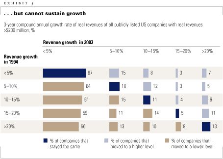 But when it comes to growth, companies are very likely to experience substantial declines (Exhibit 5). Of companies that grew by more than 20 percent in 1994, for example, 56 percent were growing at real rates of less than 5 percent ten years later. Only 13 percent of the high-growth companies maintained 20 percent real growth ten years on, and acquisitions probably drove most of it.