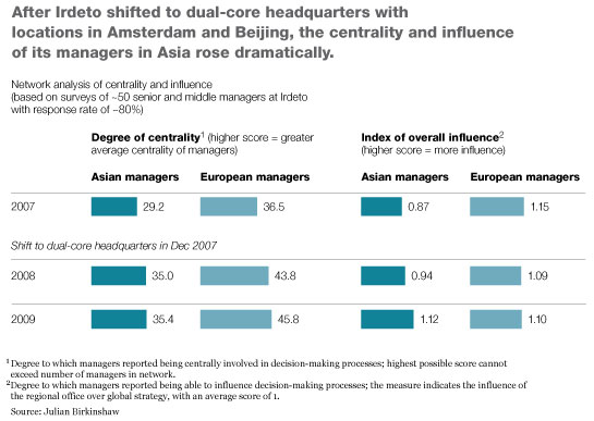 The new arrangements also led to measurable changes in internal attitudes and behavior. Irdeto allowed me to survey managers prior to the December 2007 headquarters shift, and then twice afterward, in 2008 and 2009. Among other things, I looked, using network analysis,1 for changes in the degree to which middle managers based in Asia found themselves centrally involved in and able to influence decision-making processes. The change was dramatic: the centrality of Asian (not just Chinese) managers rose more than 20 percent, and their level of influence increased nearly 30 percent. By the time of the 2009 survey, in fact, the influence scores for Asian managers actually exceeded those for Europeans (exhibit). The quality and quantity of communication between the Asian and European parts of the company also improved significantly.